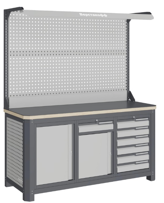 Состоит из столешницы шириной 1493 мм, рамы верстака, состоящей из опор, перемычек, боковых перфопанелей, модулей S6, S7, S8, двойного экрана с кронштейнами и комплектом освещения.